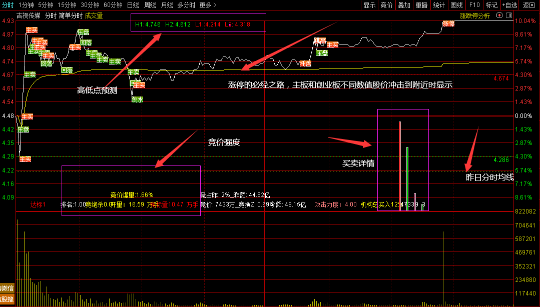 主图附加了竞价数据、排名、攻击力度、资金买卖详情、最低最高值预测、同时改良了墨轩分时四条线的显示,不会造成压缩分时主图。