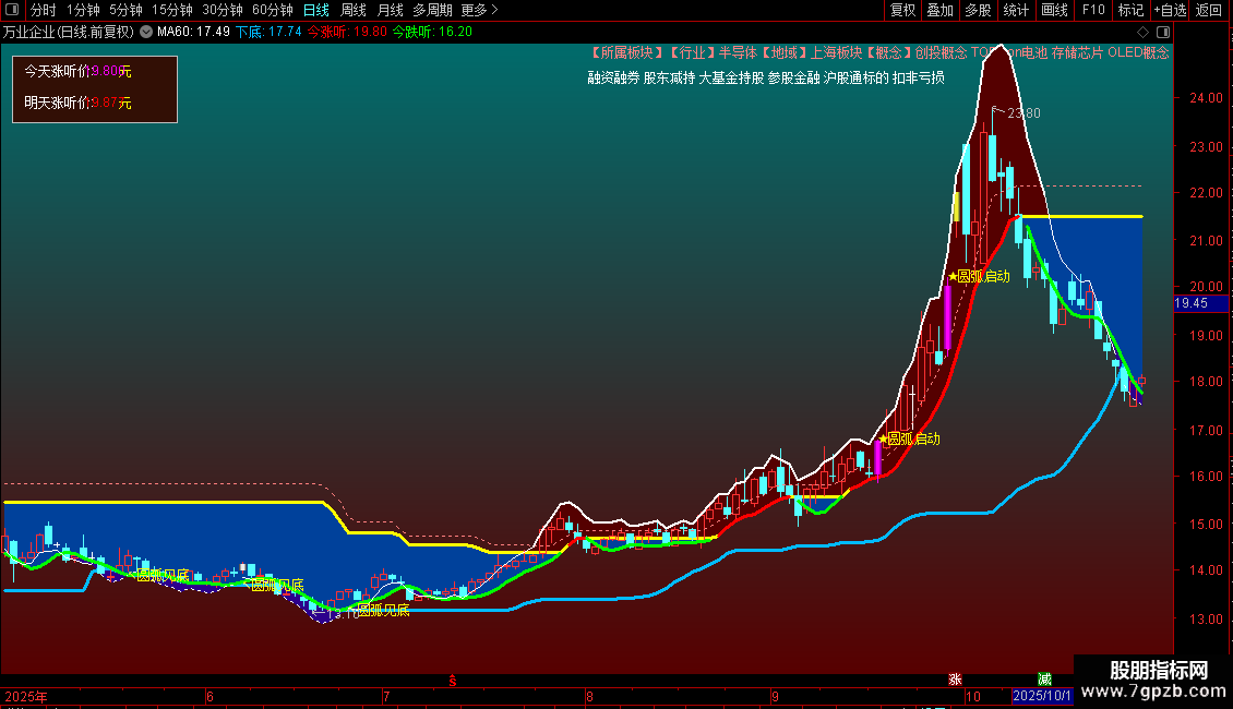 该指标通过多组均线(如3日、26日EMA)的交叉关系,结合价格突破关键阻力位(如“上顶”线)和成交量放大信号(“倍量”),识别股票主升浪的启动点。其核心逻辑包括: