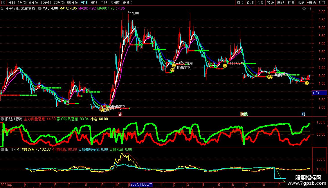 主力做盘意愿:WINNER(MA(CLOSE,5))*100,LINETHICK5,COLORRED;