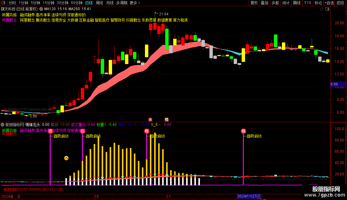 2.主图大阳线站上趋势线,叠加副图趋势启动信号,代表主升浪阶段或已开启