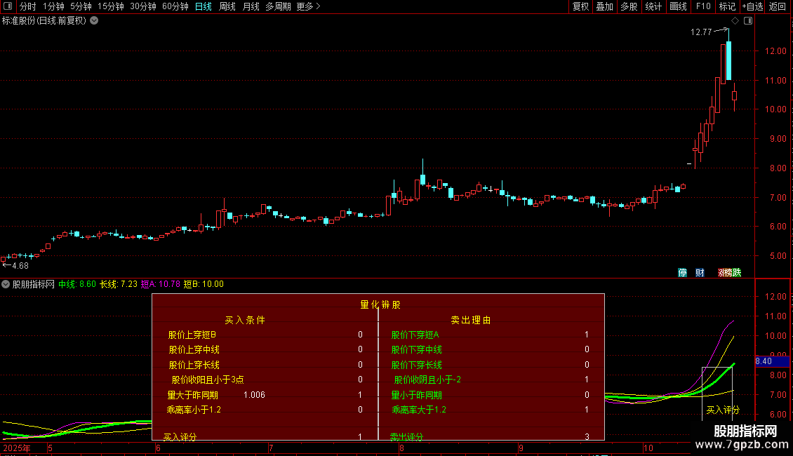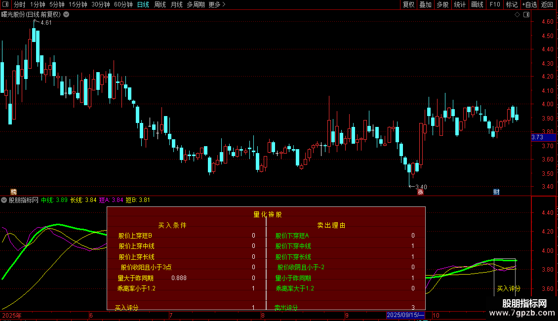 卖出评分:=T7+T8+T9+T10+T11+T12;DRAWNUMBER_FIX(CURRBARSCOUNT=1,0.78,0.95,1,卖出评分);