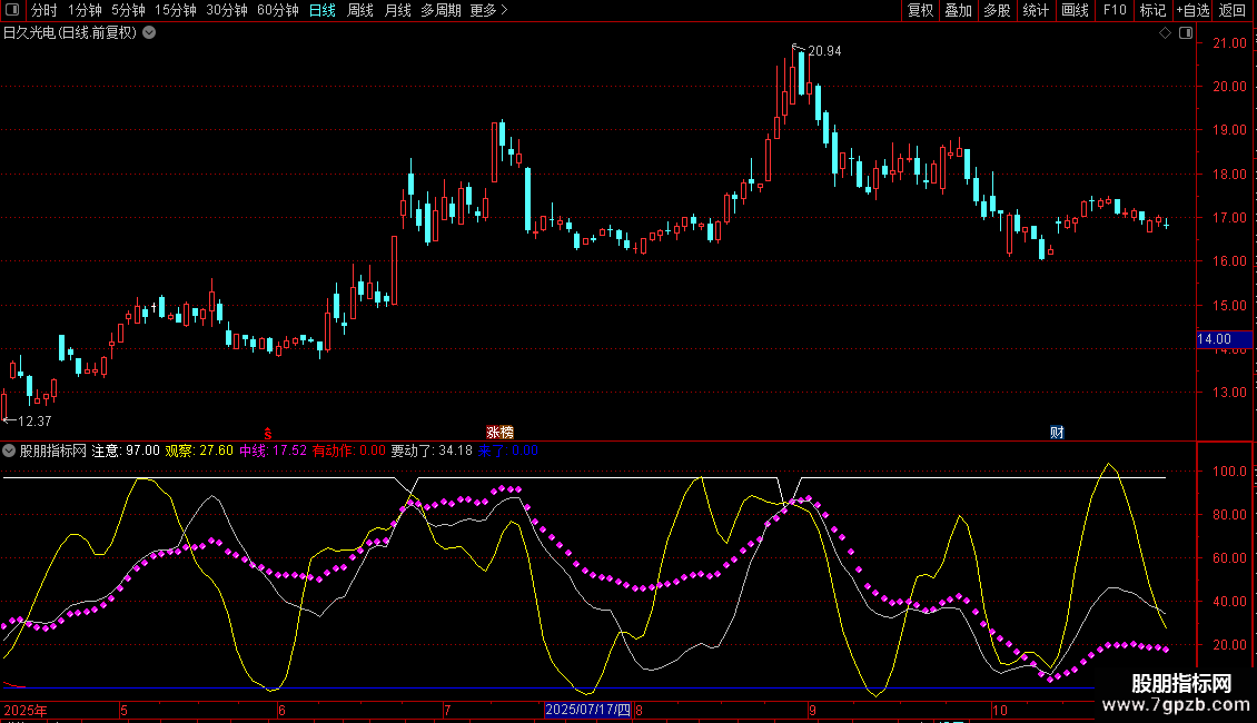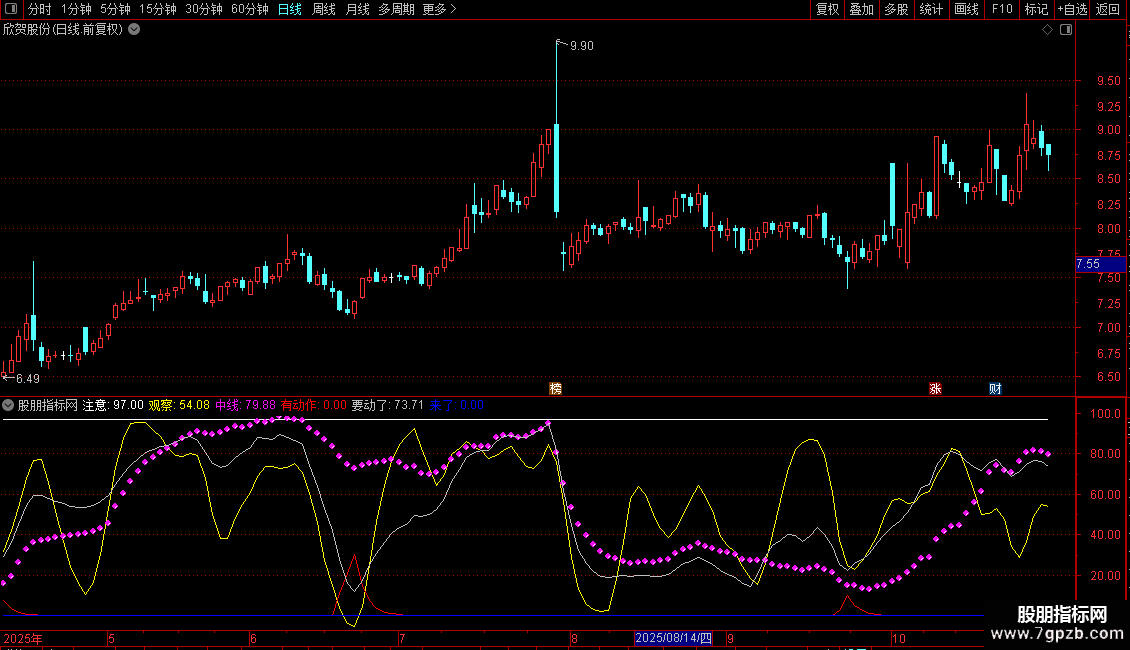 有动作:EMA(IF(LOW<=VAREA,(VARDA+VARFA*2)/2,0),3)/618*VAR10A,COLORRED;