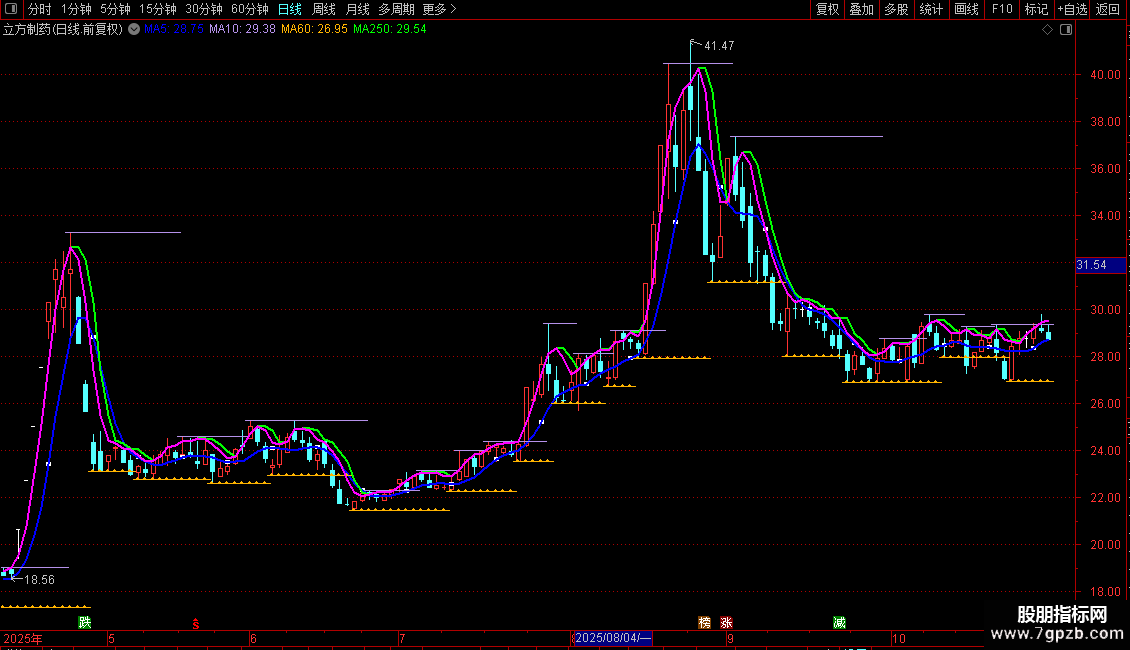 强势单线持股:LLV(MA(HIGH,(3)),1),LINETHICK2,COLORFF00FF;