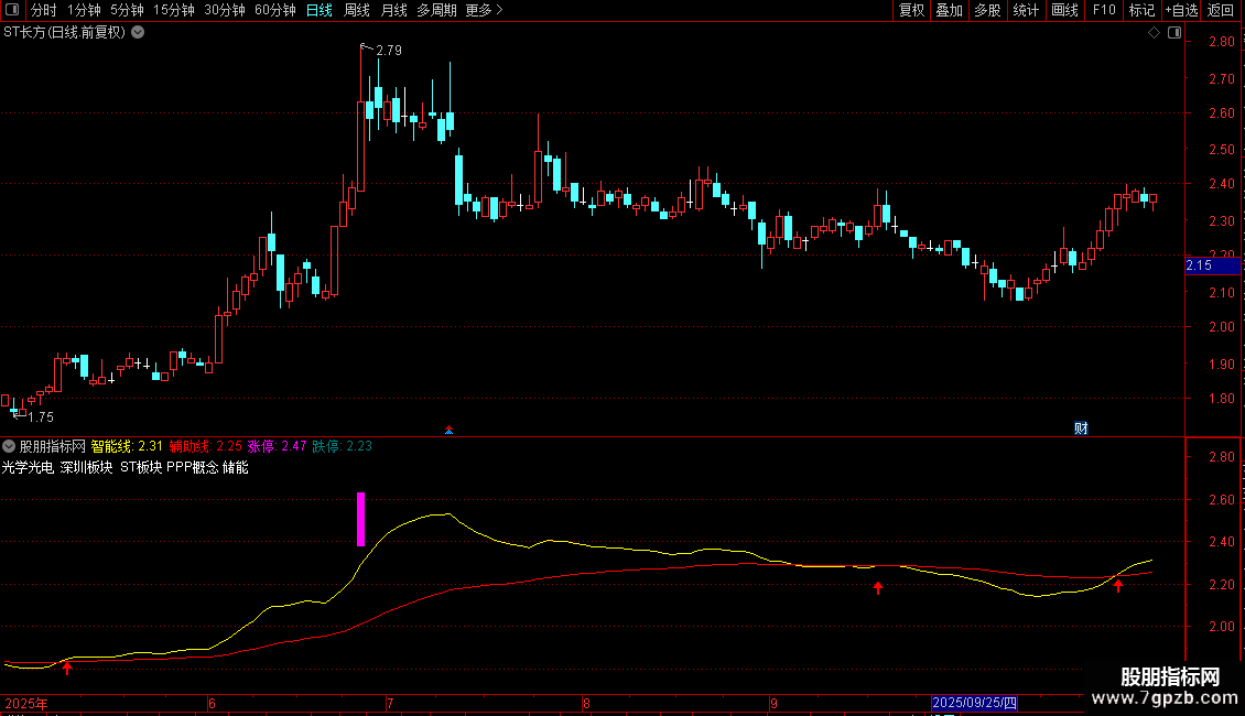 2、买入后股价沿着智能线上走继续攀升,当股价有效跌破智能线时可考虑卖出止盈。