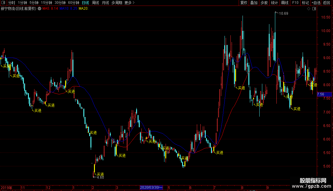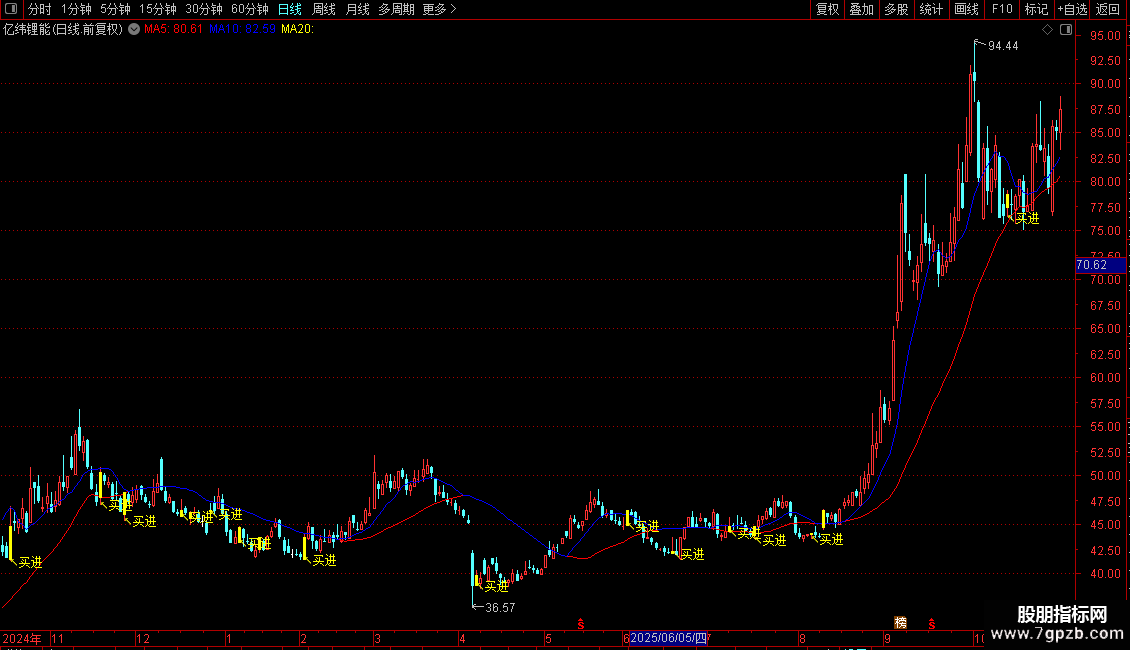 DRAWTEXT(FILTER(买=1,5),LOW-0.05,'↖买进'),COLORYELLOW;