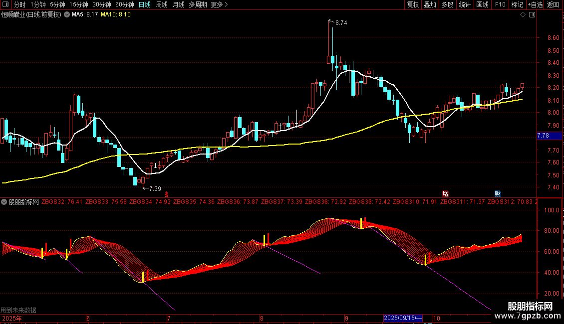 主图白线上穿黄线形成金叉,同时K线高开站上金叉位置,配合副图多头趋势线全部向上发散,构成强共振买入点,抓连板妖股更精准。