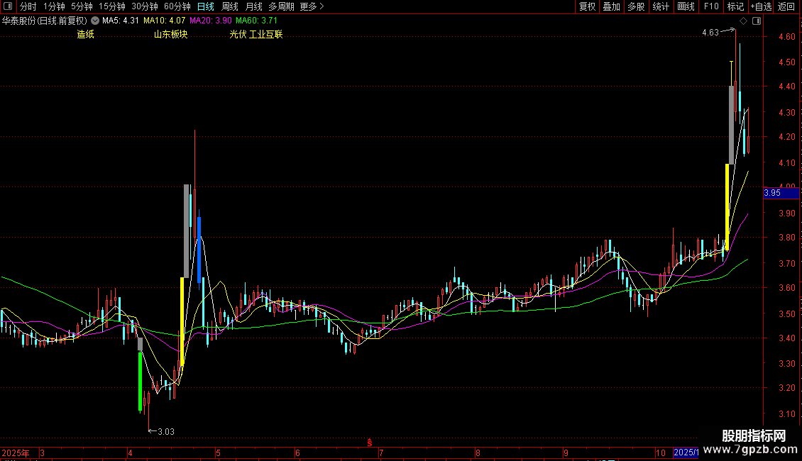 普通K线图不显示涨跌停,所以把涨停设置为黄色K线,跌停设置为绿色K线。一般大于5%的K线对于趋势扭转比较又意义,但是普通主图也是不显示的,所以把>5%的阳线设置成粉色,>5%的阴线设置成蓝色,置于K线上一目了然,非常清晰。