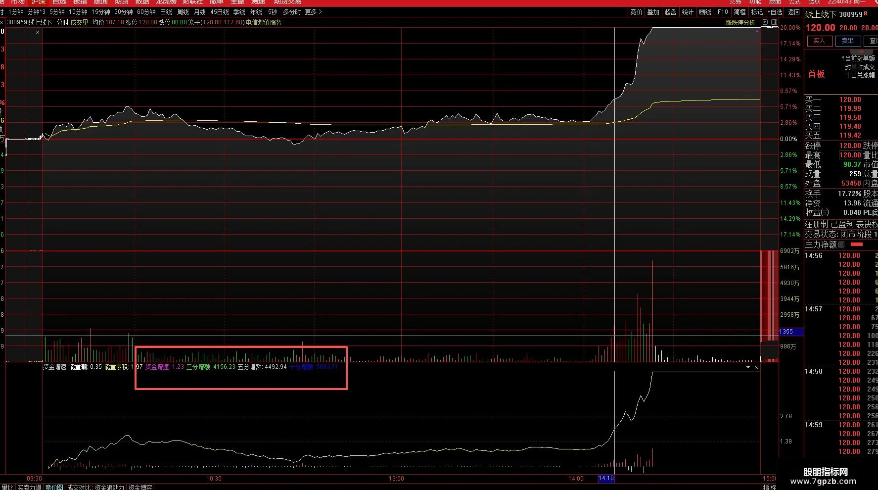本指标是自用珍藏多年的抓涨停利器,分时图中资金增速达到1以上说明增量资金激增,一般出现1或更大的数字说明涨停的概率更高。观察后面的三分增额或者五分增额看增加的金额。根据增加的金额对比走势的强弱,增额越大说明资金涨停的意愿更强烈。