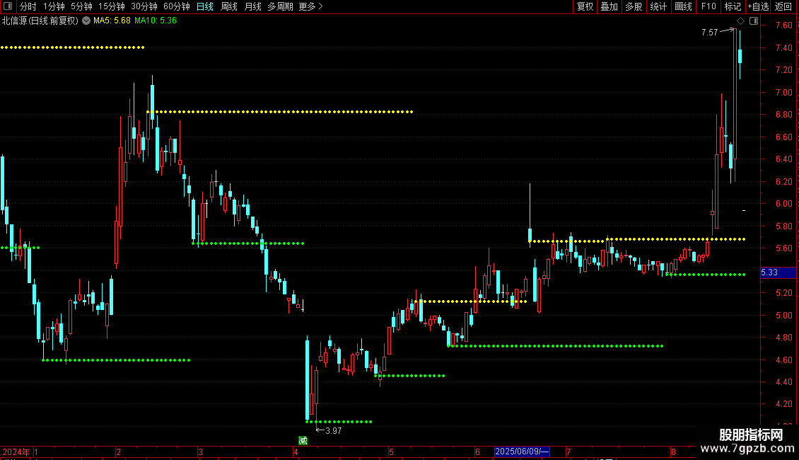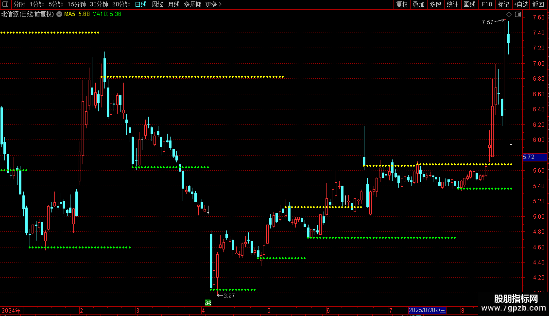 支撑:IF(T2,B,B),COLORGREEN,POINTDOT,LINETHICK4;