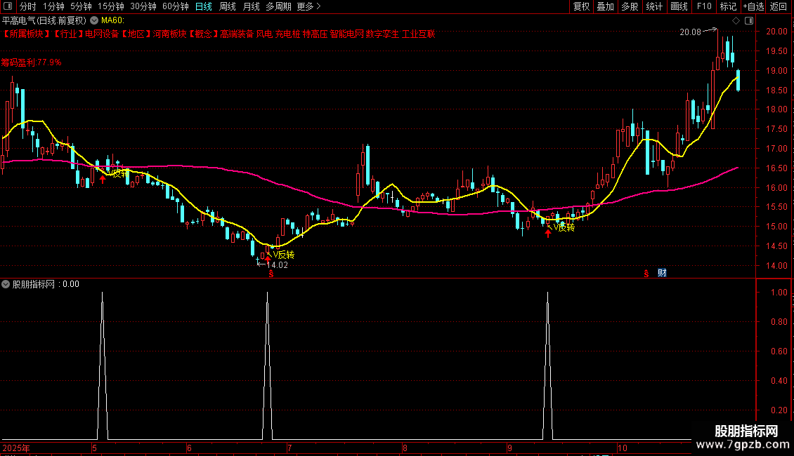 指标包含主、副及选公式,专为捕捉股价趋势V型转折设计,适用于通达信软件,可直接用于选或预警。主图核心展示生命线与趋势线:生命线作为多空分界参考,趋势线动态跟踪运行方向,当趋势线出现转向拐点时,主图会同步标注“V反转”信号,直观提示潜在转折机会。