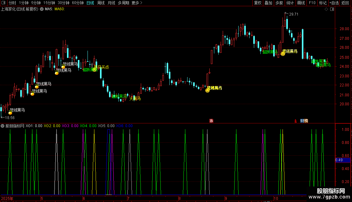 DRAWTEXT(CROSS(HG2,7.1) AND MA(V,5)>MA(V,10),MA(L,3),'短线黑马'),COLORWHITE;