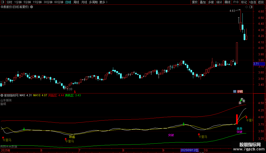DRAWTEXT((ZIG(3,5)>REF(ZIG(3,5),1)) AND (REF(ZIG(3,5),1)<=REF(ZIG(3,5),2)) AND (REF(ZIG(3,5),2)<=REF(ZIG(3,5),3)),LOW*0.94,'千里马'),COLORBROWN;