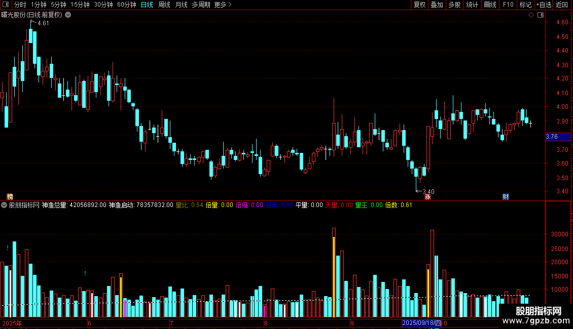 与传统的系统成交量指标比,神渔量能指标把成交量的变化规律用不同的颜色标示区分出来,并引入倍量、缩量、平量、百日低量、天量、量王的概念,使成交量的变化规律无所遁形,一目了然;传统的系统成交量指标用的是成交手数(受除权除息增发影响失真比较大),而神渔量能指标启用成交金额,更能真实的反应当天的成交情况,并弃用传统的一些指标线,独创一条动态的神渔启动线,成交量只有超过这条启动线,才有走牛的可能,这就给我们及时发现和抓住牛股、妖股提供了一个难得的契机,是量学喜爱者“攻城掠地”的必备良器。本指标参考了量学的成交量指标思路,在此表示诚挚的谢意!