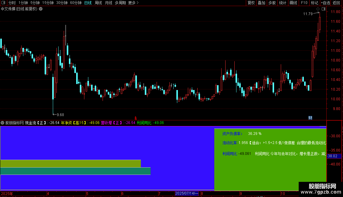 DRAWTEXT_FIX(现金流【正】>0,0,0.03,0,'当符合条件时会出现字体,说明符合条件,【经营活动现金净额】 正数越高越好理论上')COLORBLUE ;