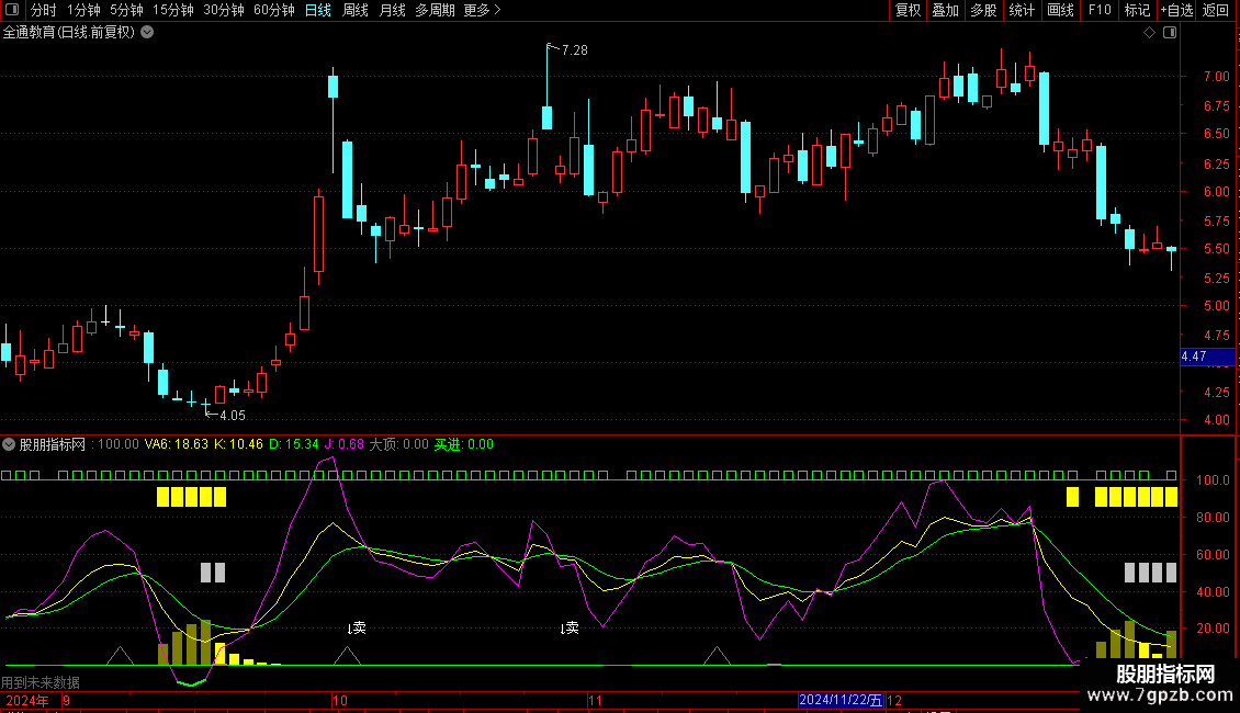 洗盘:STICKLINE(VA5<REF(VA5,1),0,VA6,2,0),COLORYELLOW;