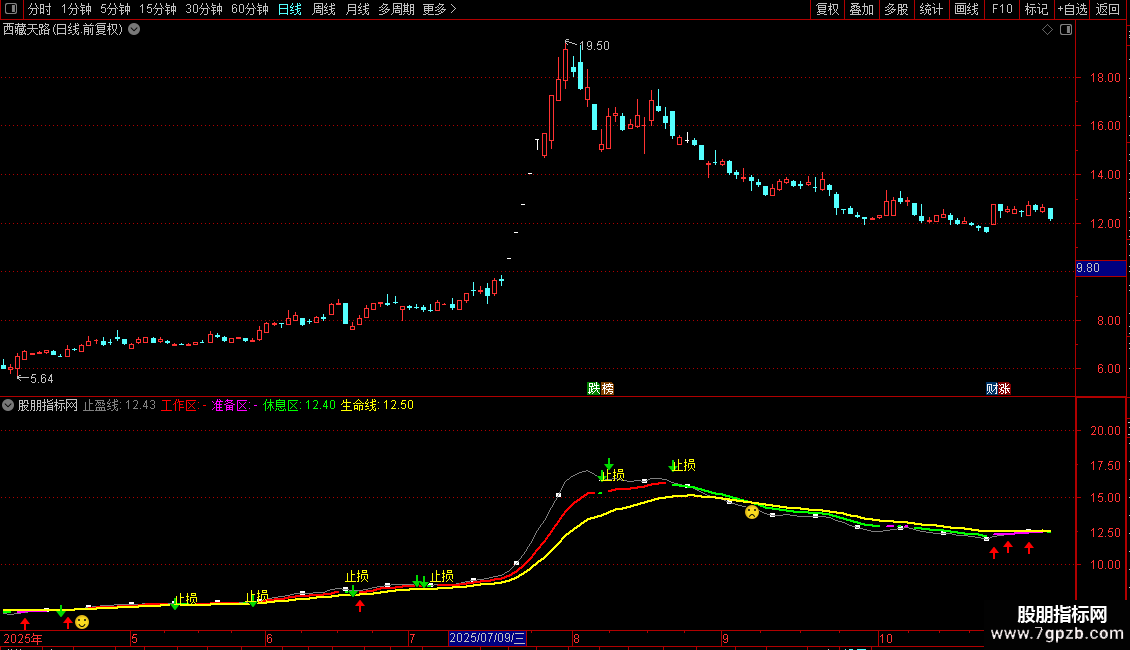 准备区:IF(C>=工作线 AND EMA(C,14)<EMA(C,25),工作线,DRAWNULL), COLORMAGENTA, LINETHICK2;