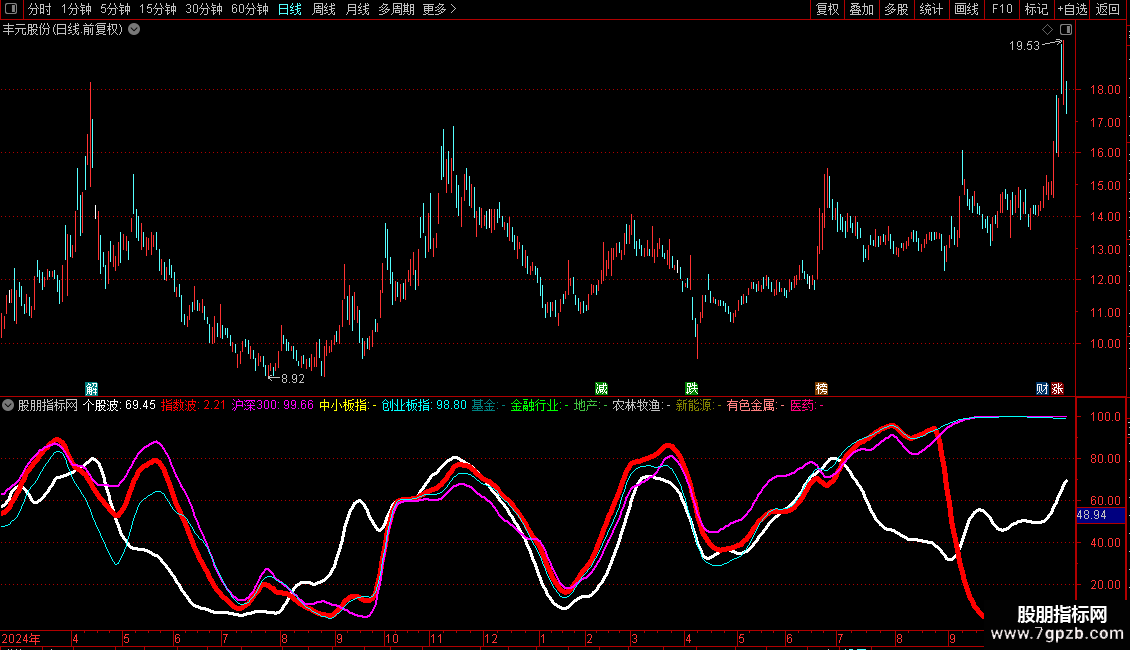 个股波:SMA(VAR4,3,1),COLORWHITE,LINETHICK3;