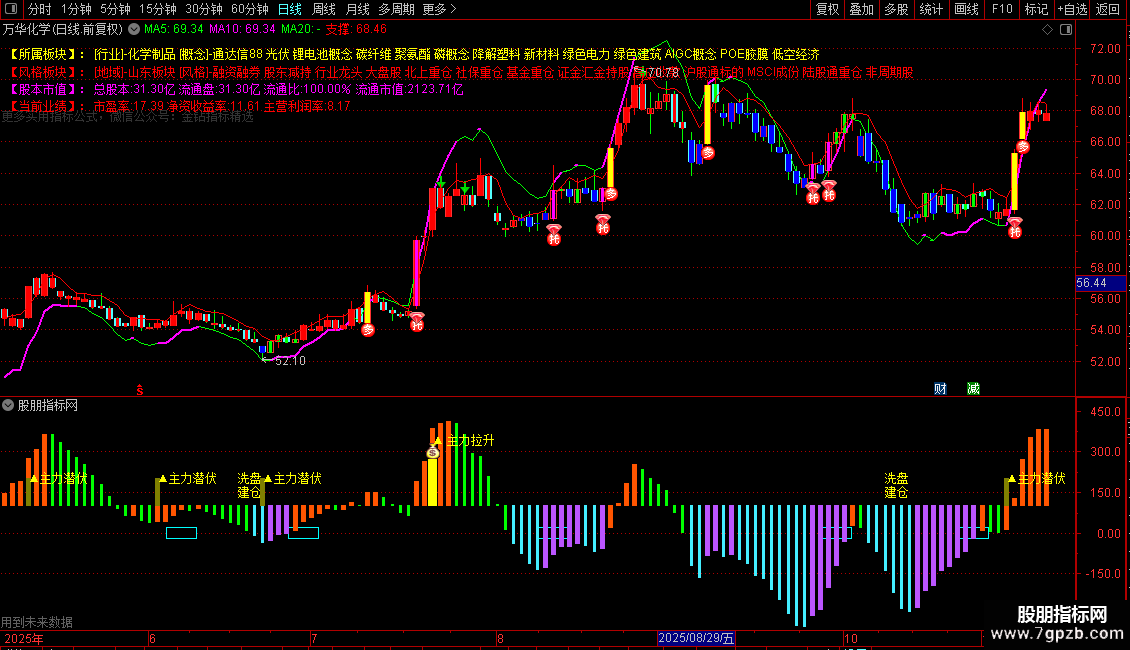 主要功能:通过多重技术指标综合判断股票买卖时机。它融合了价格趋势、动量变化、超买超卖状态和主力资金动向等多维度信号,在不同阶段给出明确的建仓、洗盘、主力潜伏等提示。