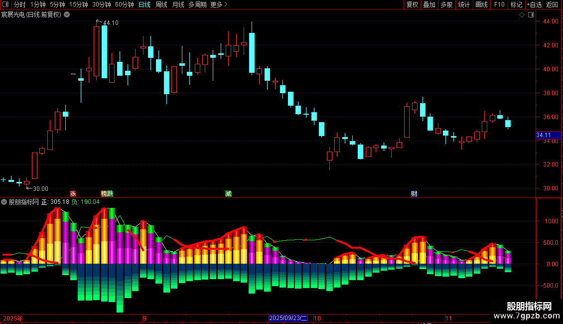 当满足条件正>0AND正>1日前的正时,在正*2/5和0位置之间画柱状线,宽度为1.5,0不为0则画空心柱.,COLOR00DDFF