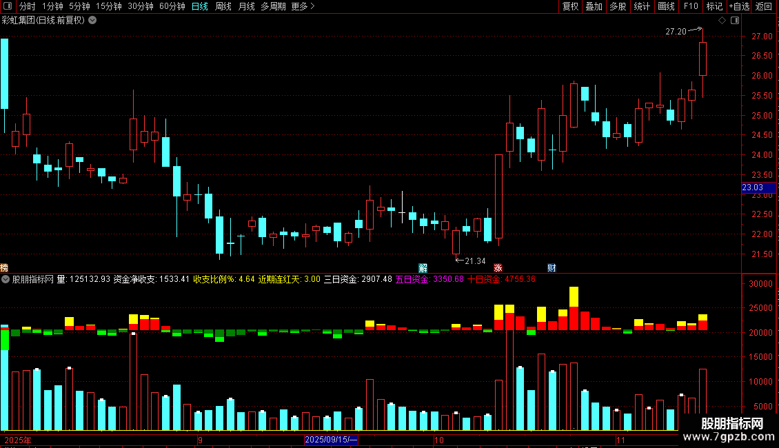 连红天1:=BARSLASTCOUNT(资金净收支>0),,COLORA20FFD,NODRAW;