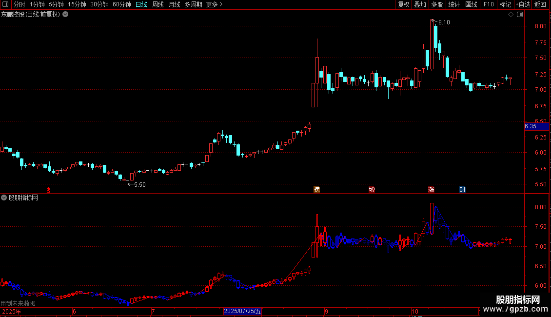 STICKLINE(MACD<REF(MACD,1),O,H,0.3,1)COLORBLUE;