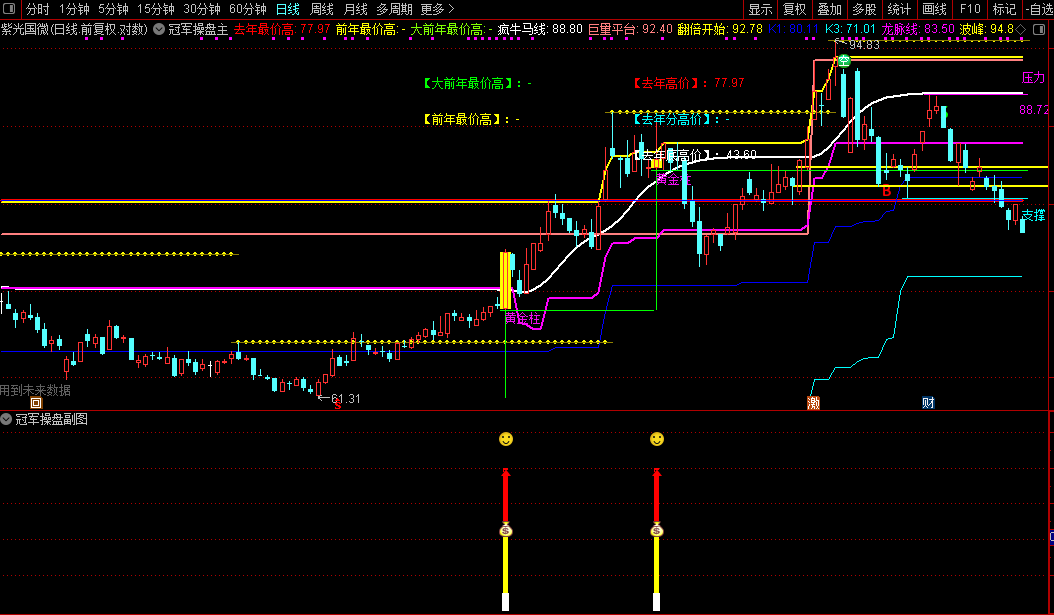 本指标系统为投资者提供全方位的技术分析支持,核心功能涵盖关键价位识别与趋势动向判断。它自动标记最近三年内的年度最高价位,直观展示长期压力水平;同时绘制疯牛马线、龙脉线等特色趋势轨道,辅助辨别多空强弱。指标还能标注巨量成交平台与阶段性起涨点,提示重要支撑与突破位置。