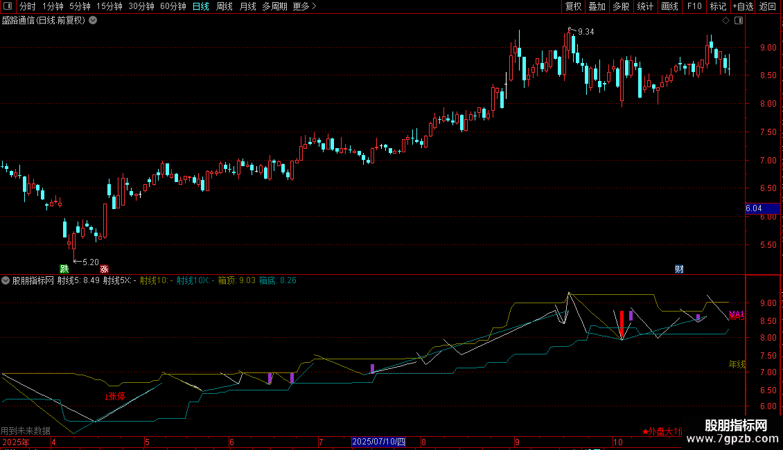 射线10X:DRAWLINE(L=LLV(L,10),L,H=HHV(H,10),L,0),COLORLICYAN;
