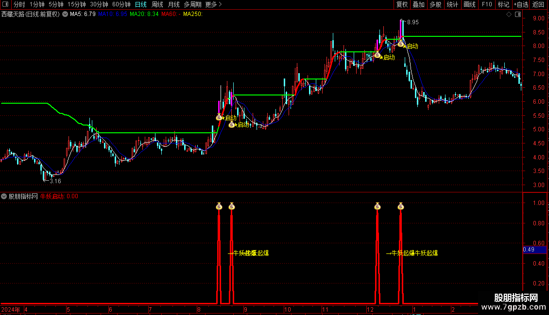 操作策略:当“牛妖启动”信号出现且当日收阳线时,视为潜在买入机会。 该信号需结合价格突破长期趋势线、特定K线组合(如前期大阳线+当前小实体阳线)共同确认。