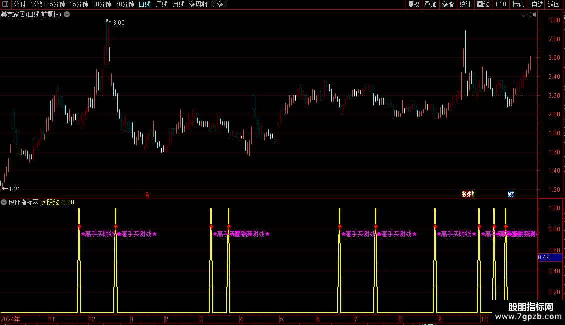 指标通过短期和长期均线的关系、价格在近期波动区间的位置,以及成交量均价的偏离度来识别买入机会。当短期均线下穿长期均线后,结合股价处于相对低位且收盘价低于均价时,在次日出现阴线且创前日新低时发出买入信号。
