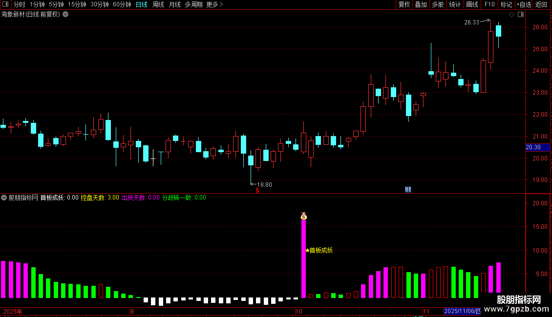 当满足条件首板成妖时,在18和0位置之间画柱状线,宽度为2,0不为0则画空心柱.,画洋红色