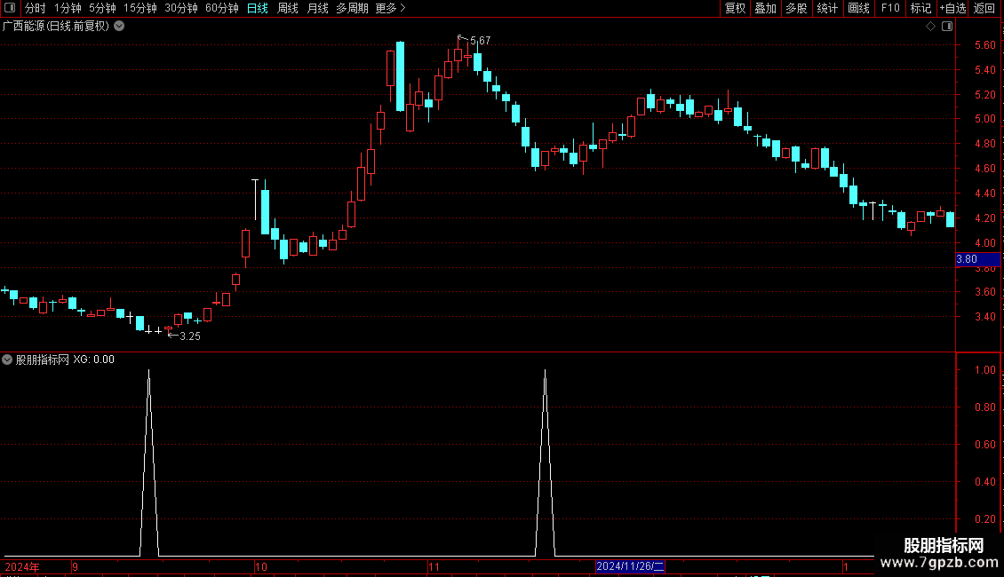输出XG:收盘价>=开盘价 AND 收盘价<=BB AND 收盘价<=EE