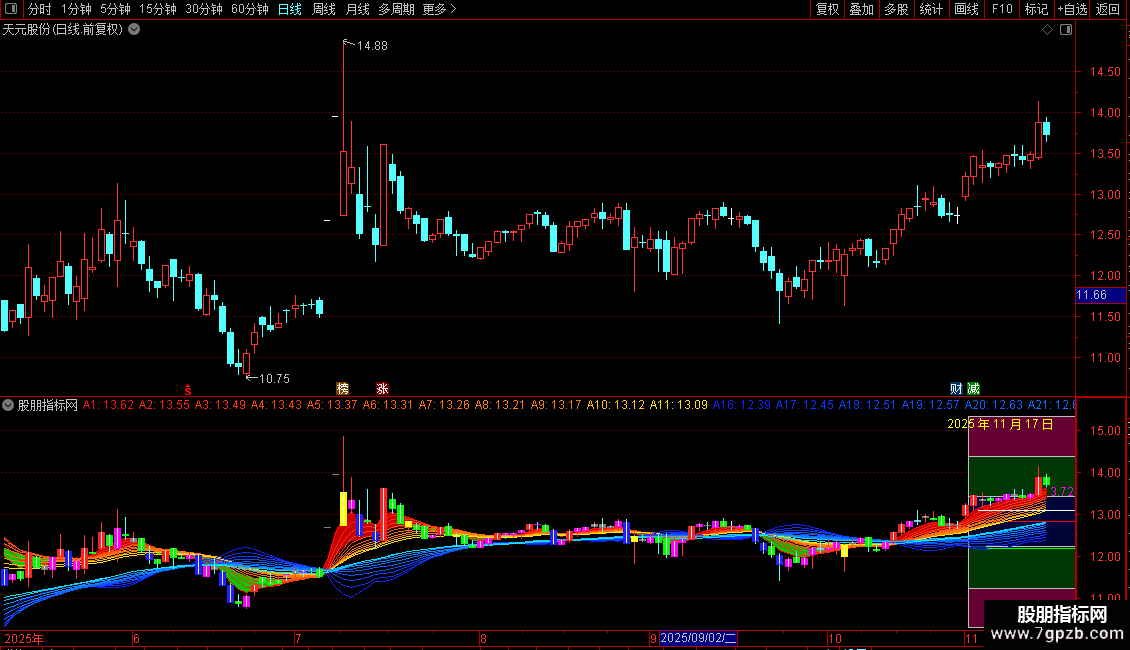 A7:EMA((EMA(C,13)+EMA(C,15)+EMA( C,17))/3,3),COLOR1070FF;