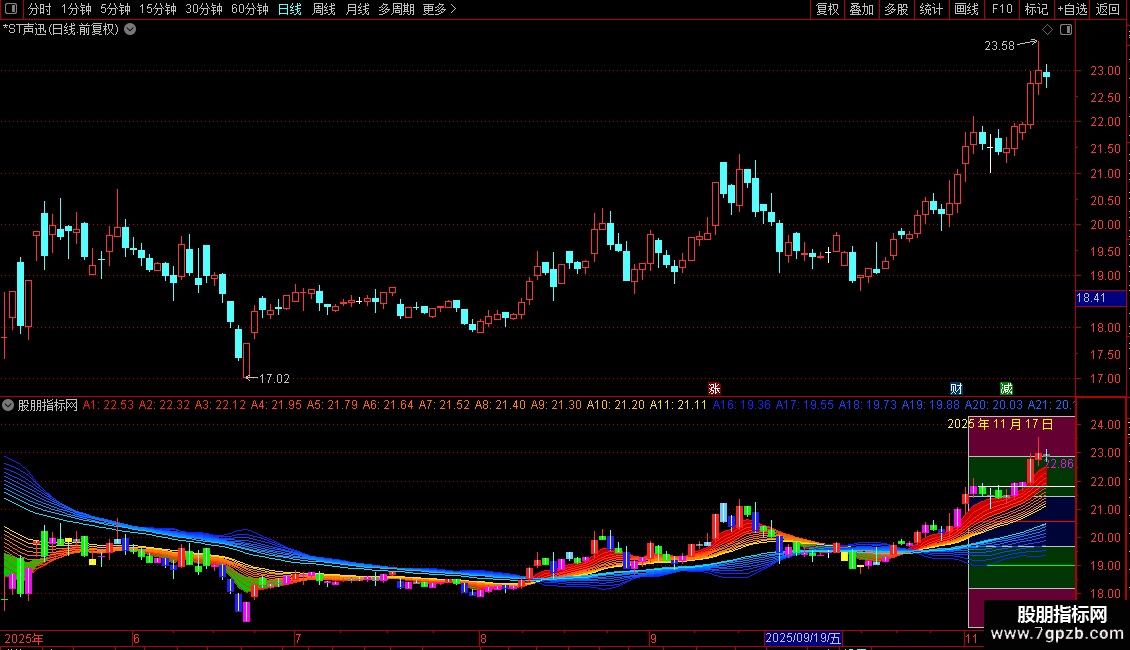 A8:EMA((EMA(C,15)+EMA(C,17)+EMA( C,19))/3,3),COLOR1080FF;