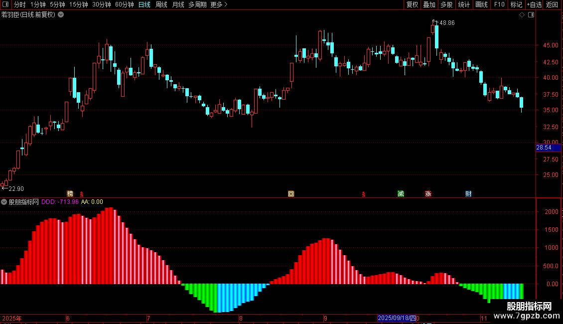 当满足条件VAR2>50ANDCOST(60)0时,在主力和0位置之间画柱状线,宽度为4,0不为0则画空心柱.,COLOR000099