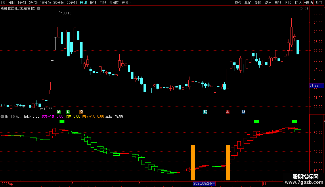 波段买入:IF(CROSS(D1,K1),55,0),COLOR0099FF,POINTDOT;