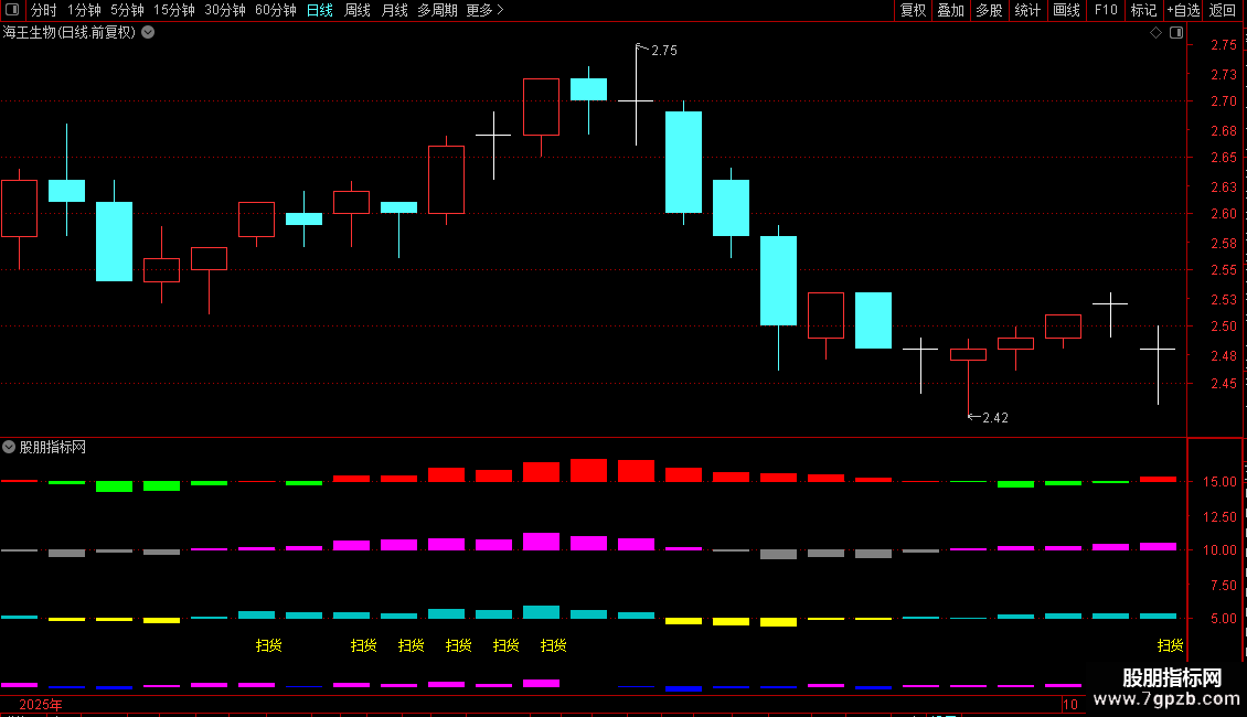 指标通过分析股价波动和成交量,计算不同时间周期内的资金流向变化,用柱状图直观展示多空力量对比。当短期(1天、3天、5天、10天)资金流向同时转为正值时,会显示“扫货”信号,提示可能的市场机会。