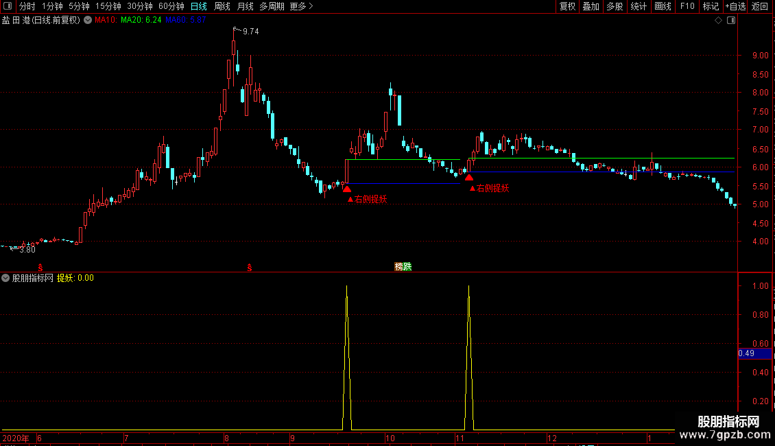 DRAWTEXT(TDZB7,LOW-0.075*LOW,'▲右侧捉妖'),COLORRED;