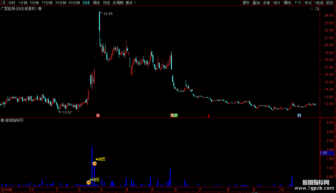 1.资金抱团指标柱体出现表示慢慢游资金在介入,同时柱体的长短表示主力资金量的大小,当达到一定量能表示多路资金由分歧转向一致,提示抱团信号。