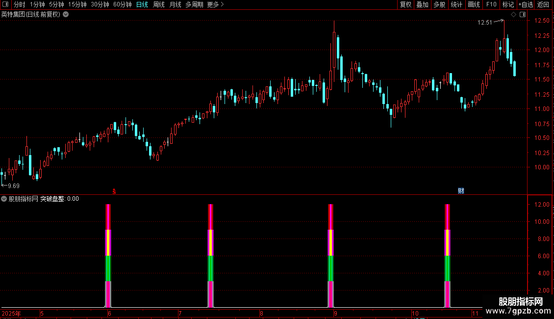 DRAWTEXT(突破盘整,1.5,''),COLORRED;