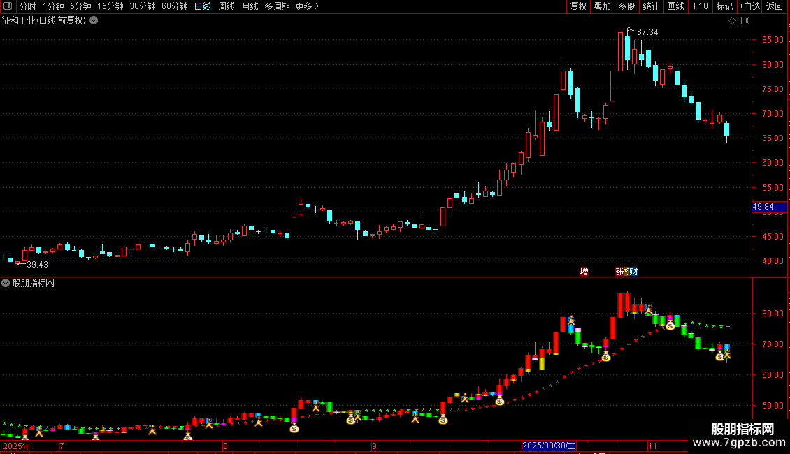 STICKLINE(CLOSE> REF(CLOSE,1),HIGH,LOW,0,0 ),COLOR000DDD;