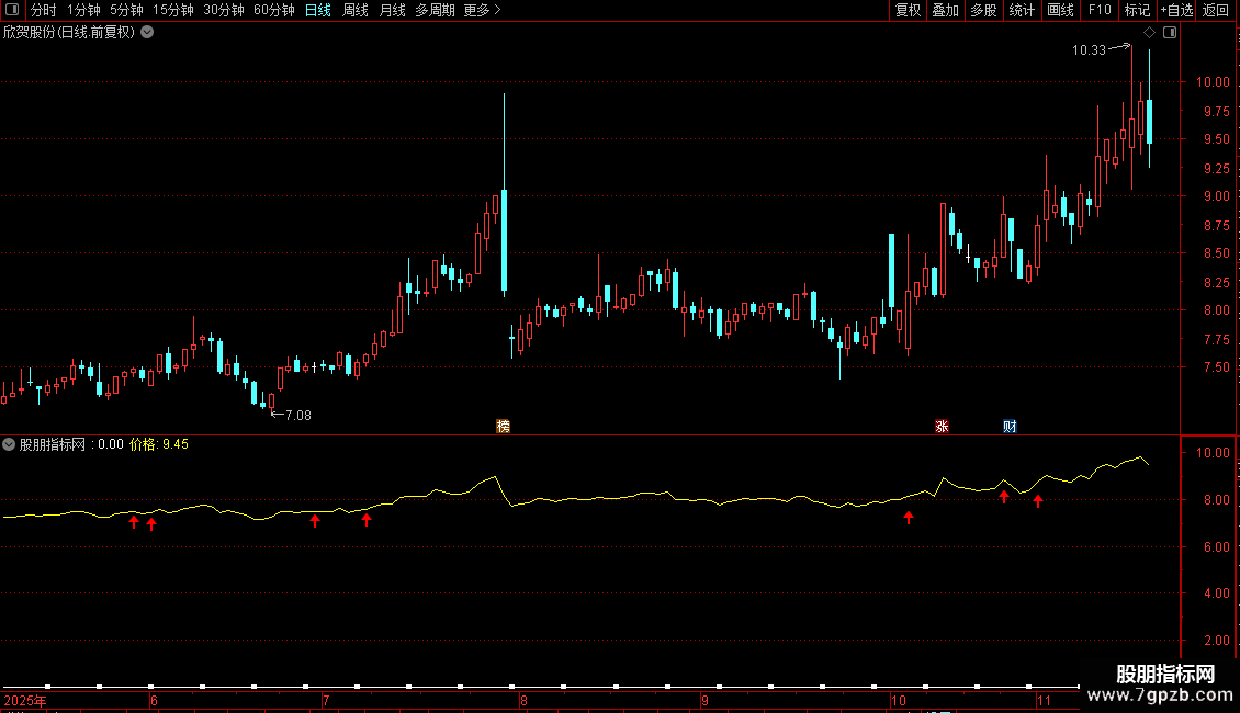 当趋势强度突破其均线且随机指标的慢线开始拐头向上时,标记买入信号。