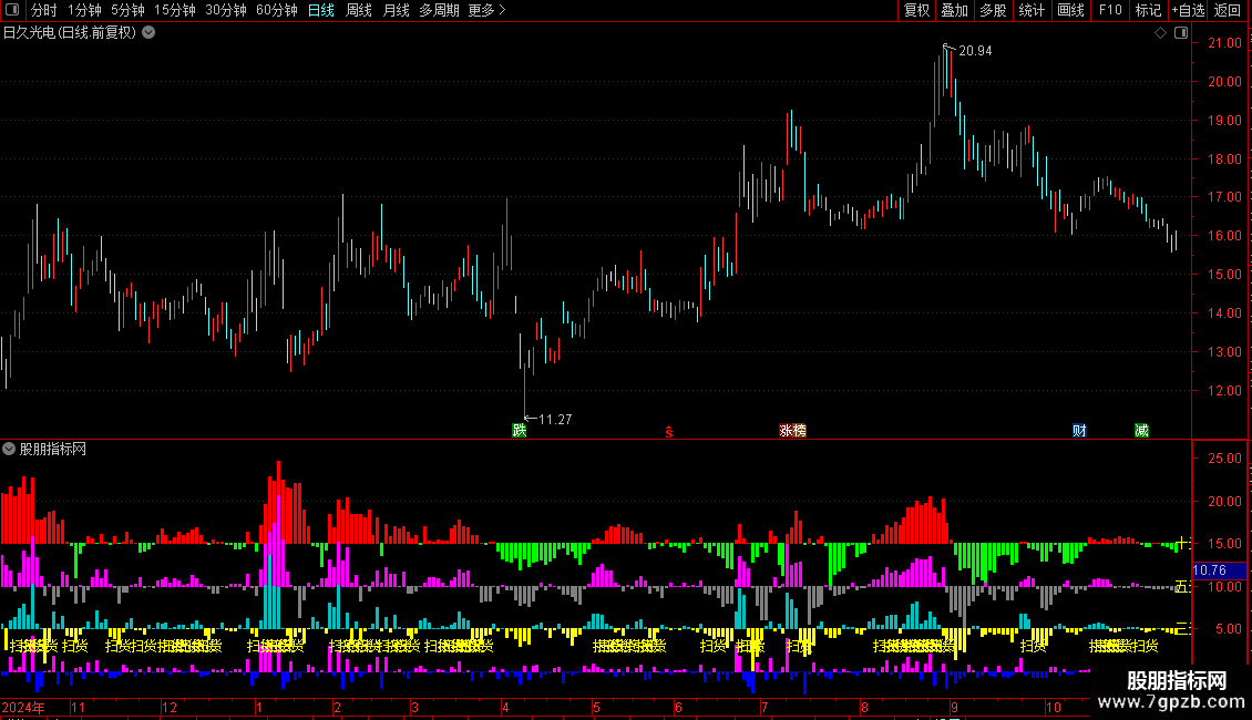 DRAWTEXT(ISLASTBAR=1,IF(VAR20>=0,15,15),'十天'),COLORYELLOW;