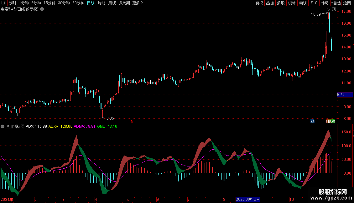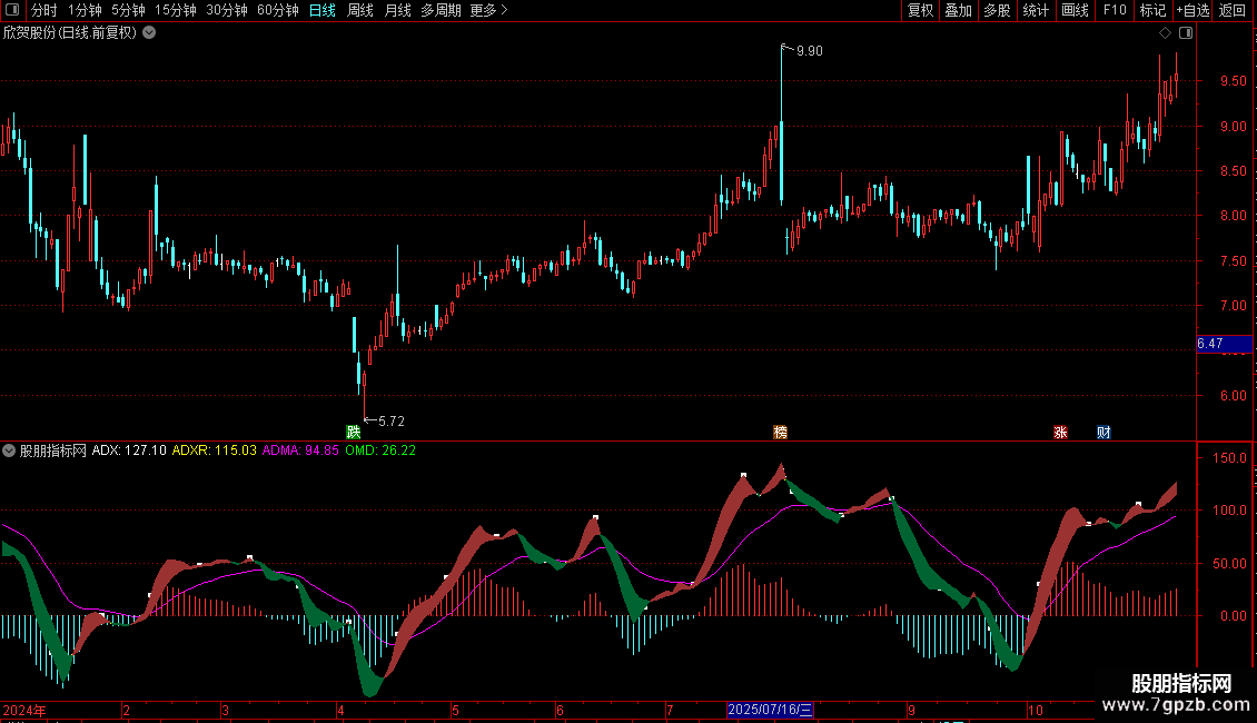 OMD:(ADX-2*ADMA+ADXR)/2, COLORSTICK;
