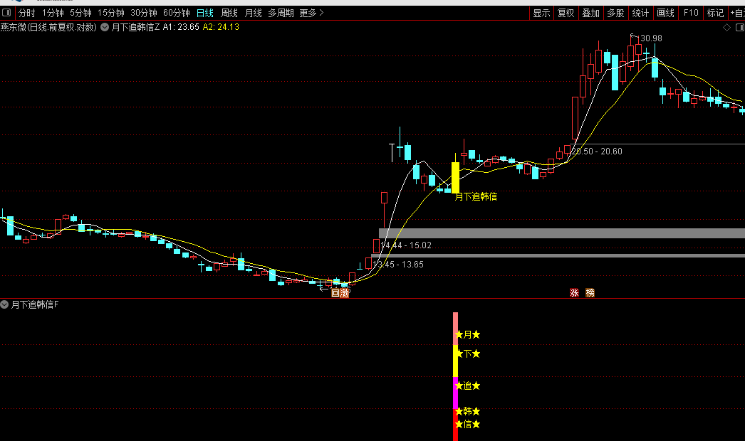 通达信【蒹何月下追韩信】主副/选股回调放倍量二波买入指标源码分享