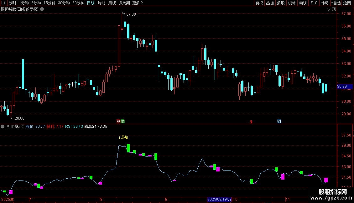 DRAWTEXT(CROSS(RSI,80),H*1.03,'↓调整'),COLORYELLOW;