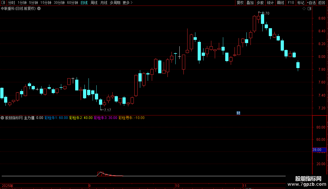 彩柱寻牛指标包含副图与选股功能,属底部类技术指标。信号出现表明进入底部区域,存在反转机会,且信号无漂移,源码支持手机电脑双端通用。
