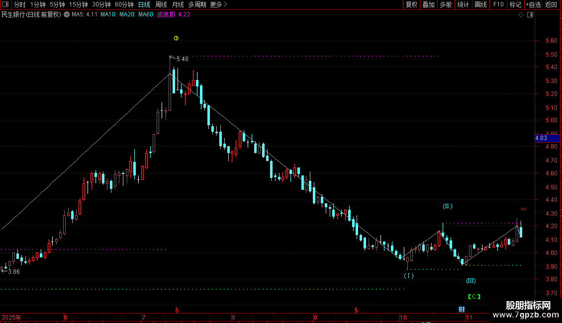 DRAWTEXT(EN1 AND PL10>REF(PL10,1) AND ZTJZ5=3,LOW*0.98,'⑷'),COLOR0000FF;