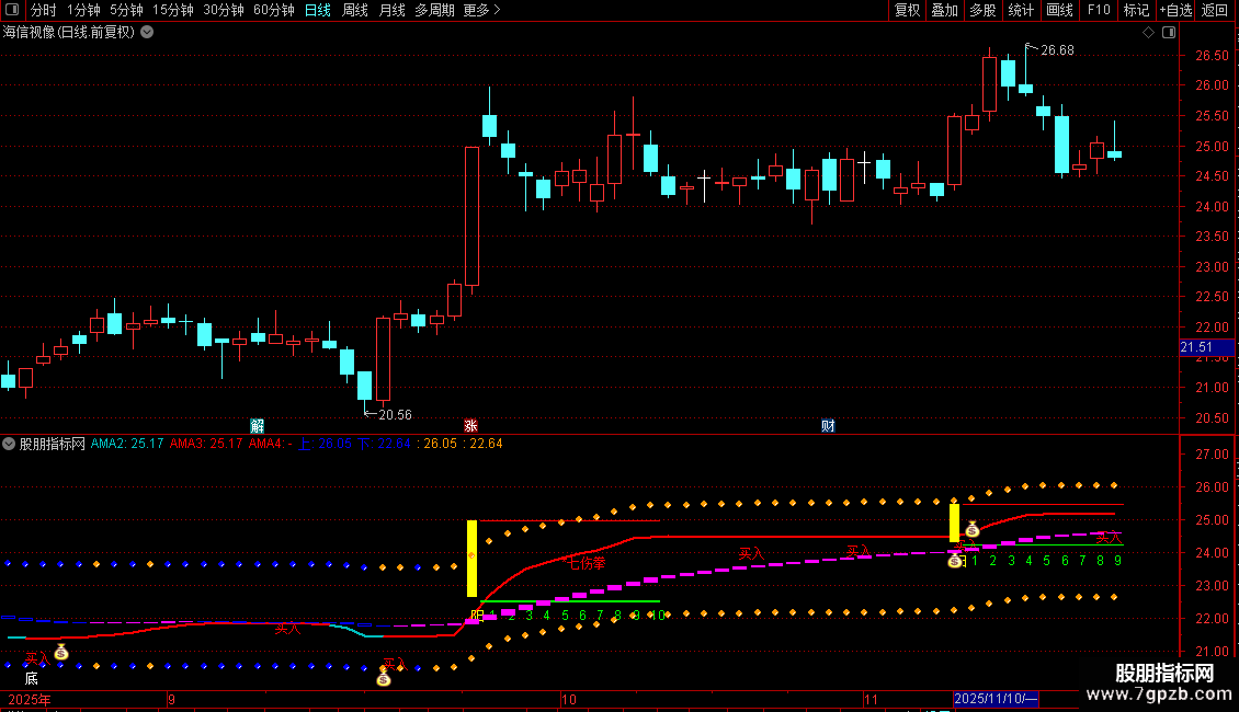 上升:=IF(红轨道>=绿轨道,绿轨道,DRAWNULL),COLORRED,LINETHICK2;