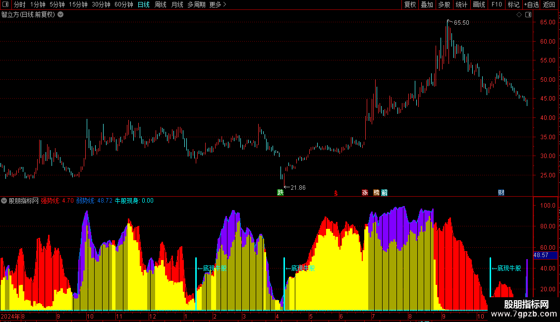 牛股现身:IF(CROSS(强势线,9),50,0),STICK,LINETHICK3,COLORFFFF00;