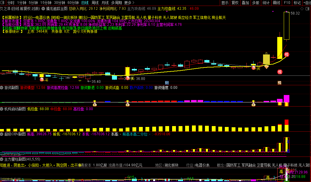 本指标包含:1主图:擒龙追踪和4幅图:分别是主力量柱、超级OBV、机构启动、游资